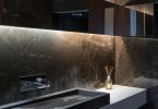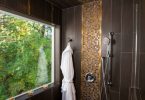 В деревянном доме этим материалом можно полностью или частично закрыть стены. Вы создадите в помещении неповторимый стиль, сочетание керамической отделки и оцилиндрованного бревна выглядит очень эффектно.