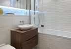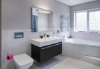 Заранее позаботьтесь о защите сантехнических приборов и мебели: отделочные работы оставляют после себя грязь. Накройте ванну, если не планируете ее менять. Для этого хорошо подходит полимерная пленка, закрепить материал можно с помощью скотча.